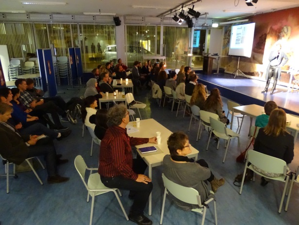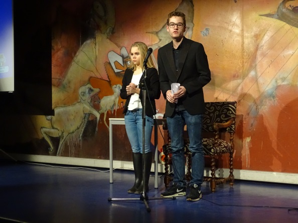 Wat hebben we genoten van Spraakwater vorige week vrijdag (28 november). Vanaf het donkere, koude Mercatorplein stapten de vele toeschouwers een warme en sfeervolle aula binnen. Hier bracht een aantal leerlingen aan het begin van de avond en in de pauze op verschillende plekken muziek ten gehore. Het podium was prachtig aangekleed en bood een knus leeshoekje met bijpassende fauteuil. Vanaf deze stoel werden later op de avond ontroerende gedichten en spannende verhalen voorgedragen. Daarnaast bood het podium ook ruimte aan de dappere woordkunstenaars die ons verrasten met een quiz, toneel, cabaret, een heuse talkshow, een mooi luisterliedje en een pakkend debat. Spraakwater nam ons in razendsnel tempo mee op reis van het Cornwall van Tristan en Isolde via het land van Teddybeer Toetje en het berglandschap van de trollen, naar de fietstocht van de heer Desmense door de Bommelerwaard en de organisatie van de Olympische Spelen in Nederland.